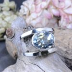 This 9.5 carat oval White Topaz shows clear brilliance and crisp refraction. Known for its purity and light, it pairs beautifully with bright Argentium silver for a refined, modern look.
