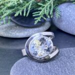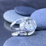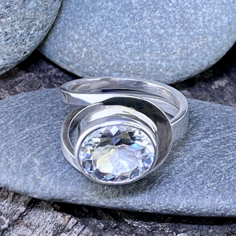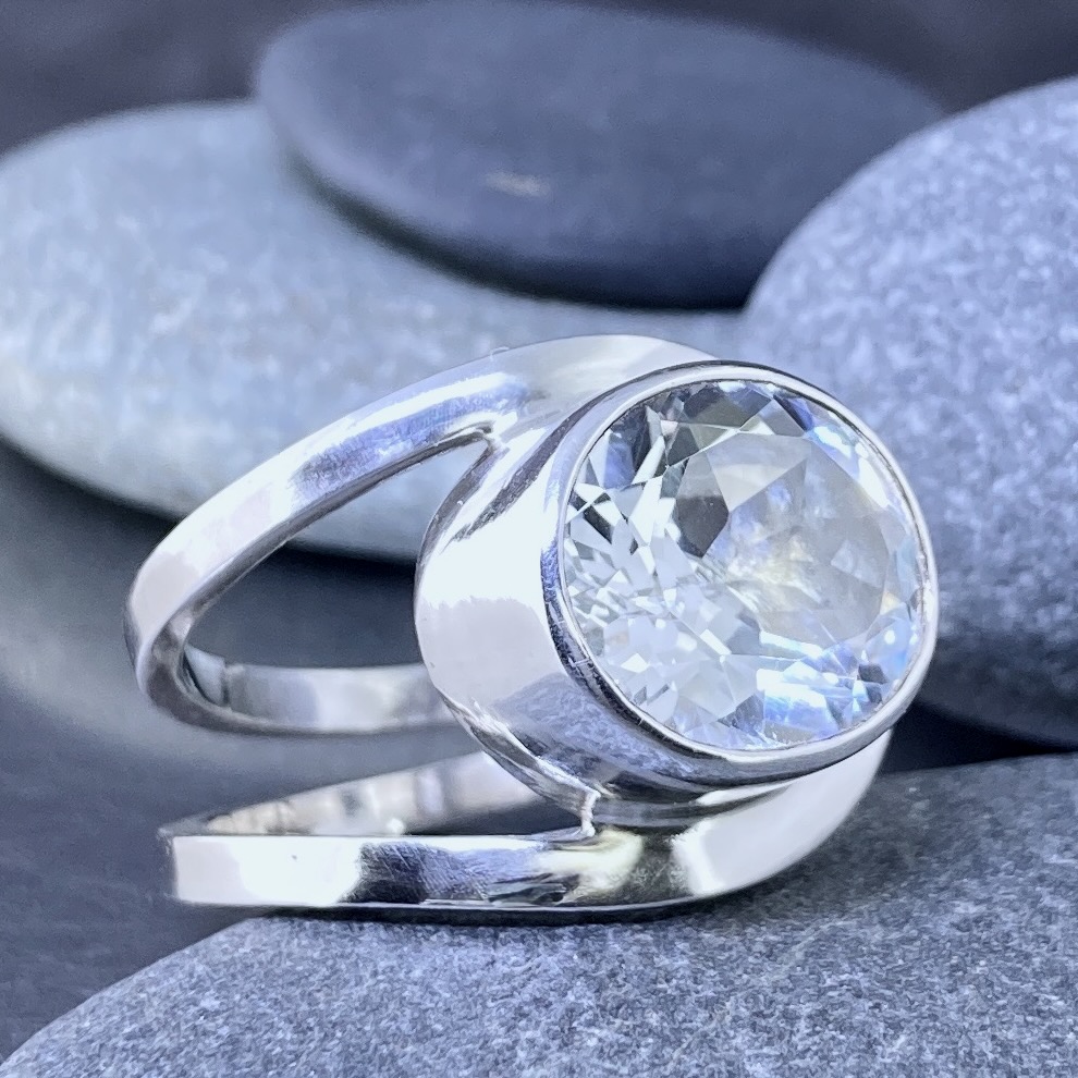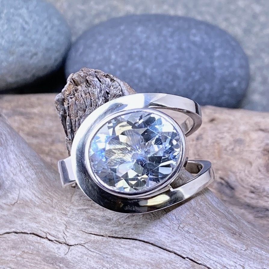 Because this ring is made with Argentium silver, I then heat-treat the piece to activate the germanium oxide layer. This treatment raises hardness and increases tarnish resistance. After the treatment, I set the White Topaz in the bezel and give a final polish for clarity and shine.