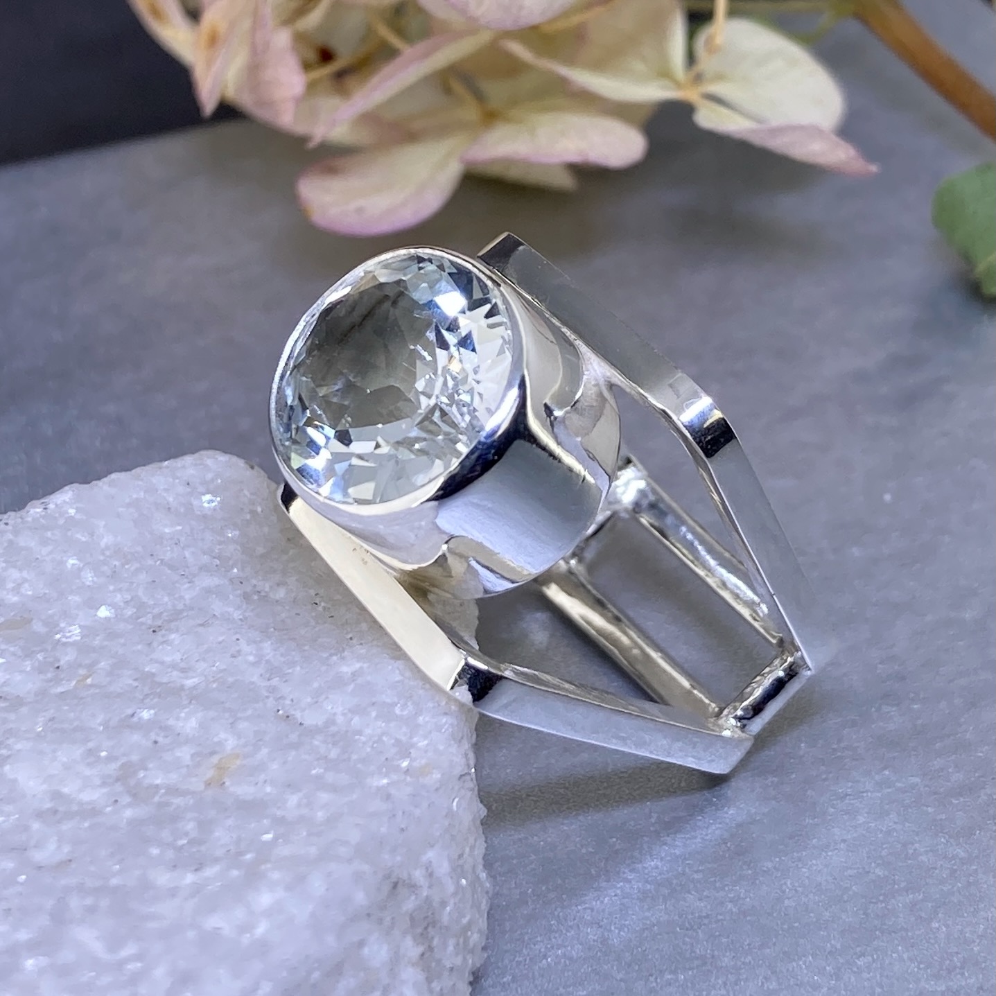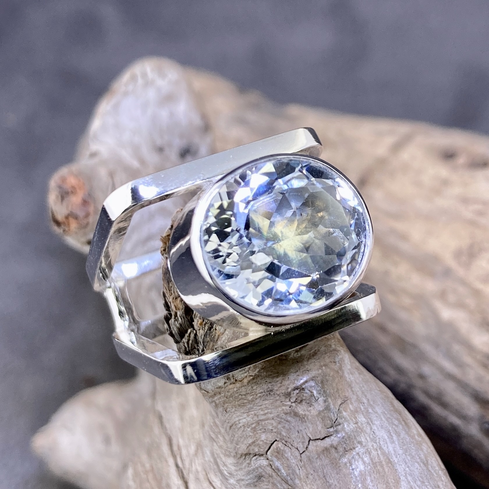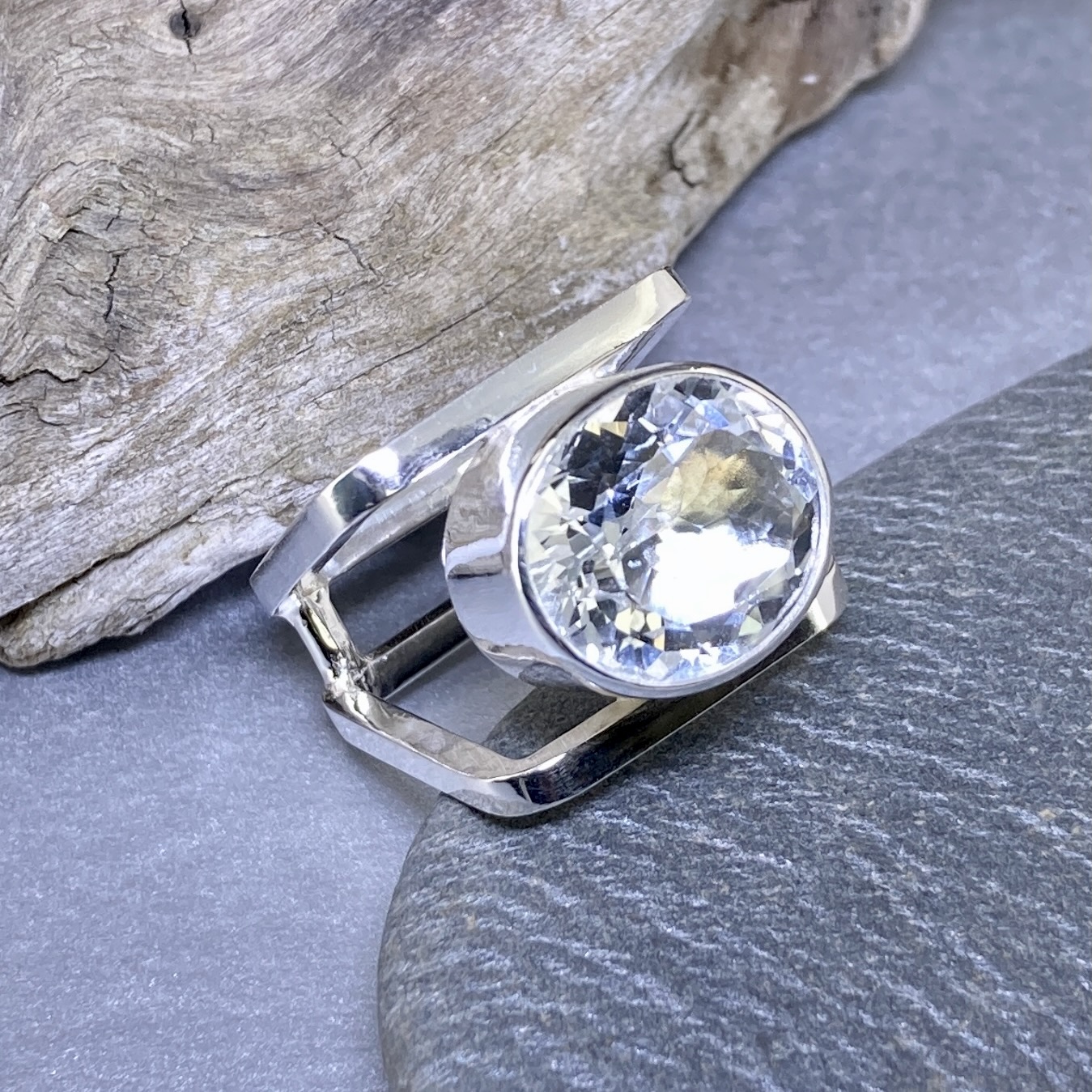 Each White Topaz ring is handcrafted in Argentium 940 silver. The twin square bands are joined at the base, creating a clean split that supports the large stone. The mirror finish reflects light from every angle. Because the ring widens at the front and narrows at the back, it feels bold yet comfortable to wear.