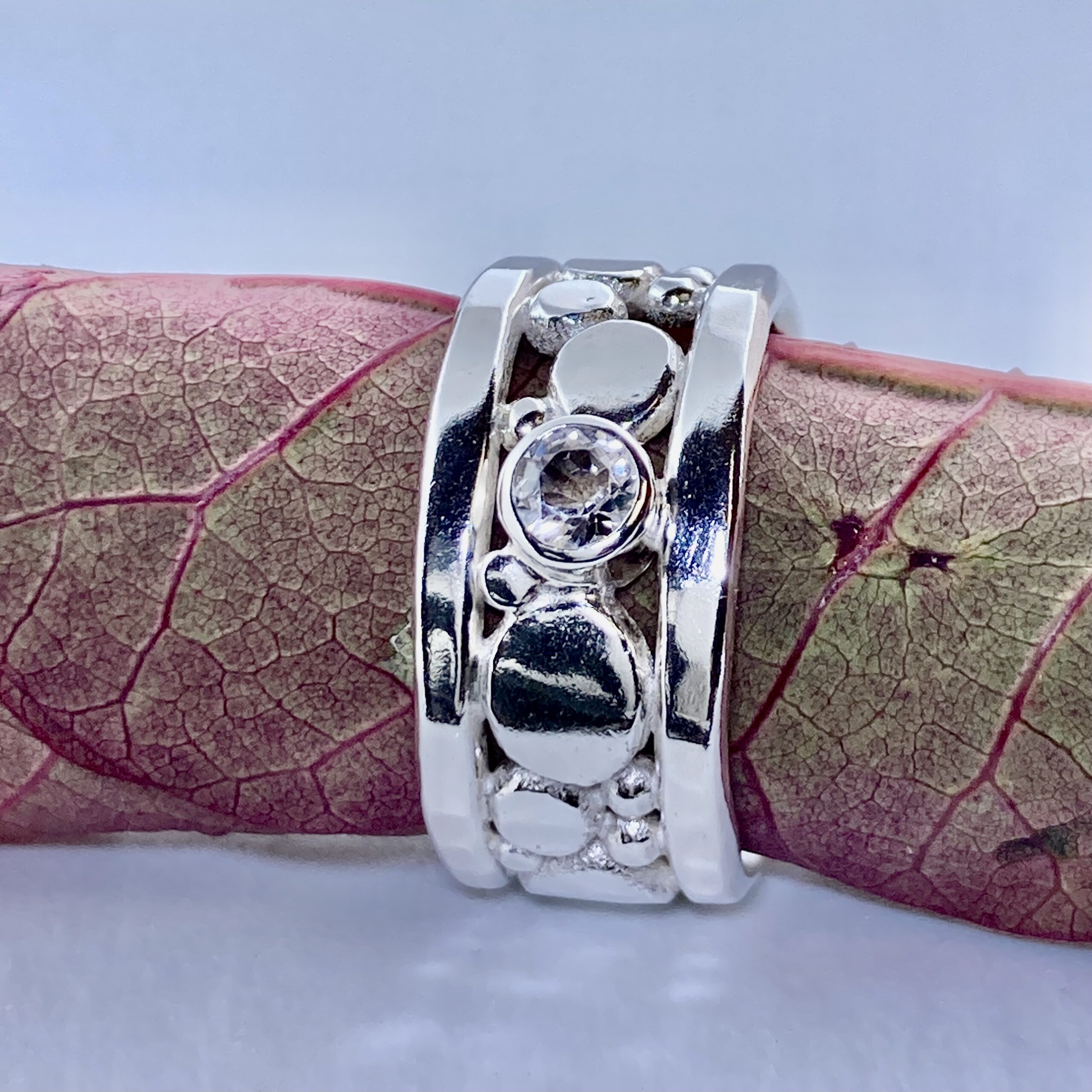 The White Topaz Ring Size 5.75 Argentium Silver Flat Granules blends strength with quiet brilliance. I handcrafted this design from solid Argentium sheet, forming a band covered in fused silver granules that reflect light in a subtle, rhythmic pattern. The piece holds a large white topaz in harmony with the silver’s grounded presence.