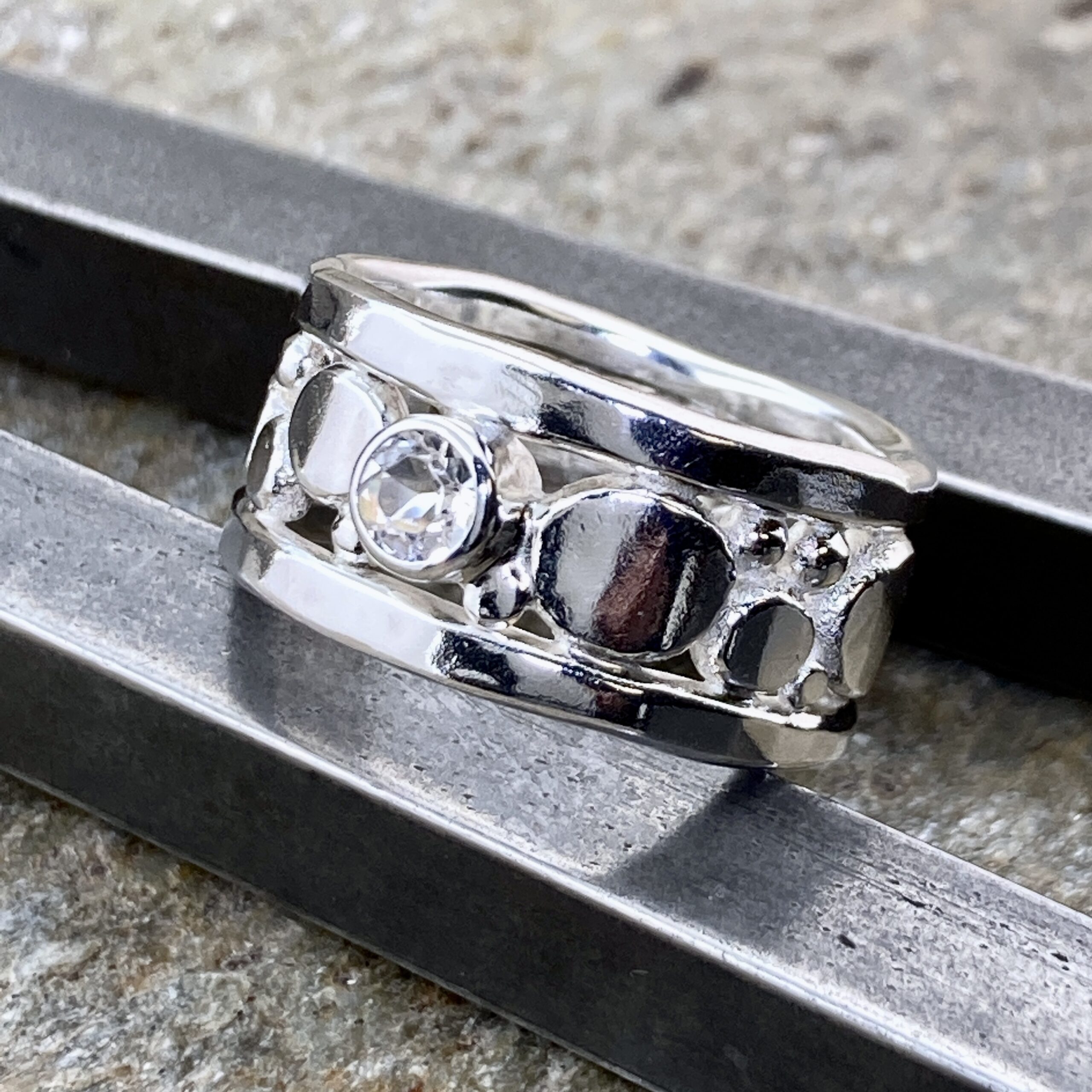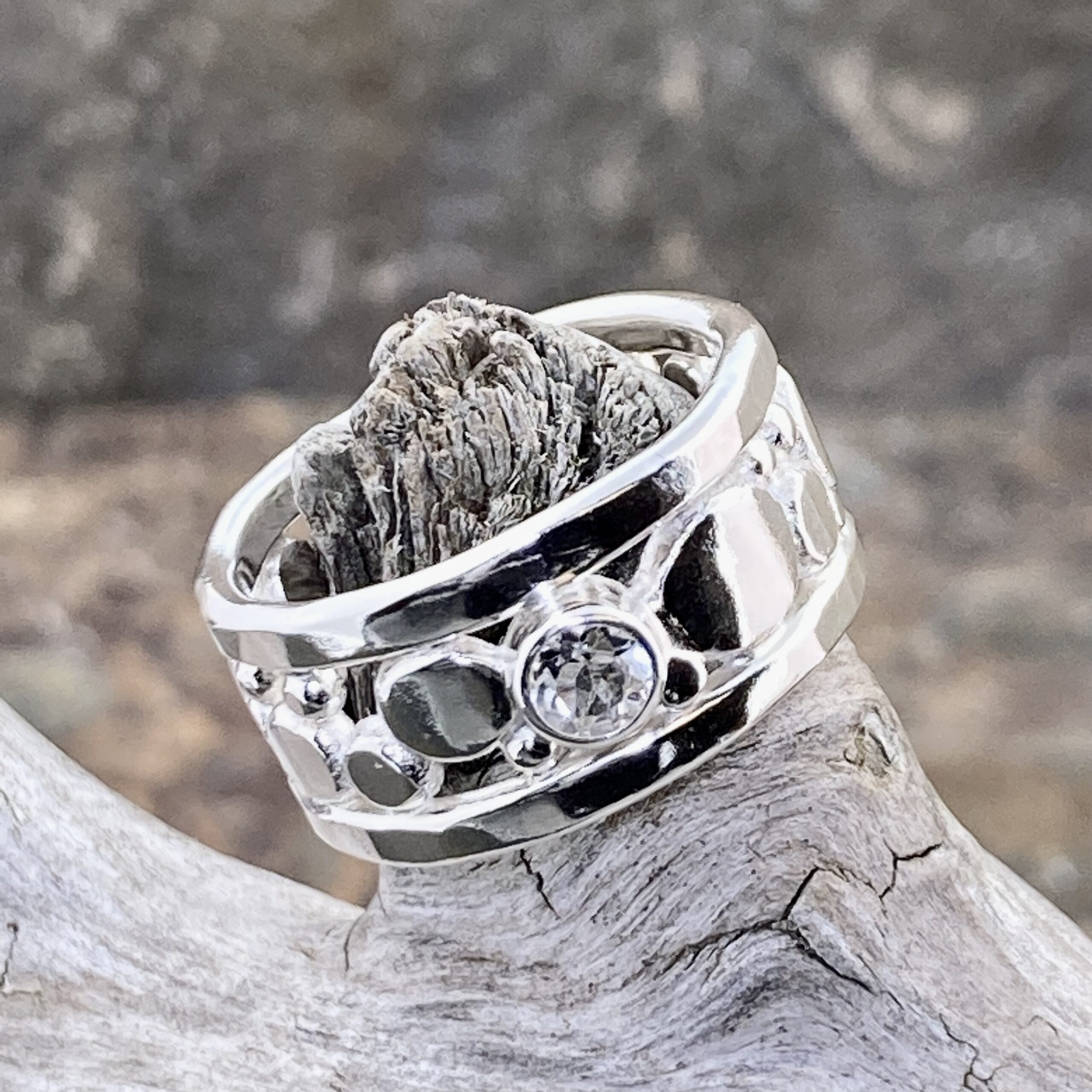 White topaz, clear and enduring, captures light like water over rock. Its transparency enhances the silver beneath, and the bezel edge protects the stone while keeping a low, balanced profile.